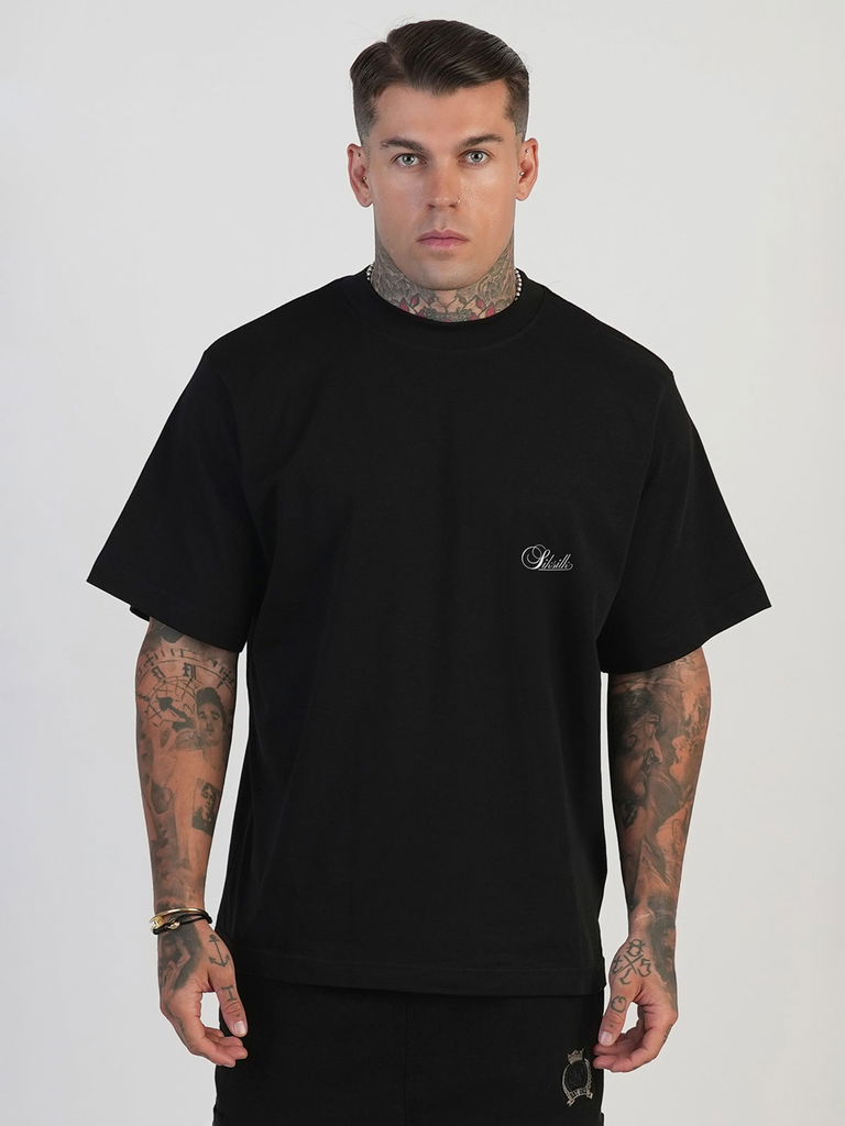 Svart t-shirt från Sik Silk med en diskret logo tryckt på bröstet. Matigt och rejält tyg. Rymliga storlekar med lätt drop shoulder. (184cm/81kg strl M)