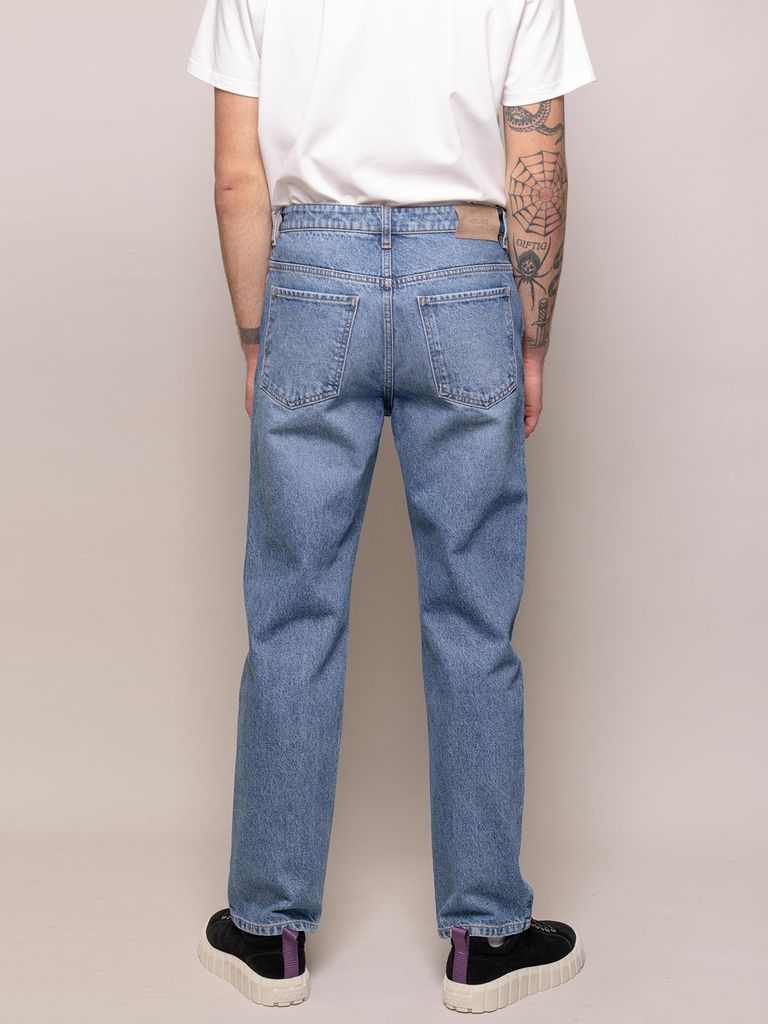 Curtis från Just Junkies. En vid modell utan stretch. Här i ljusblå tvätten New Sea Blue. Läderpatch baktill med logo. Normala storlekar men lösa i modellen. (På bild 184cm/82kg och strl 31/32)