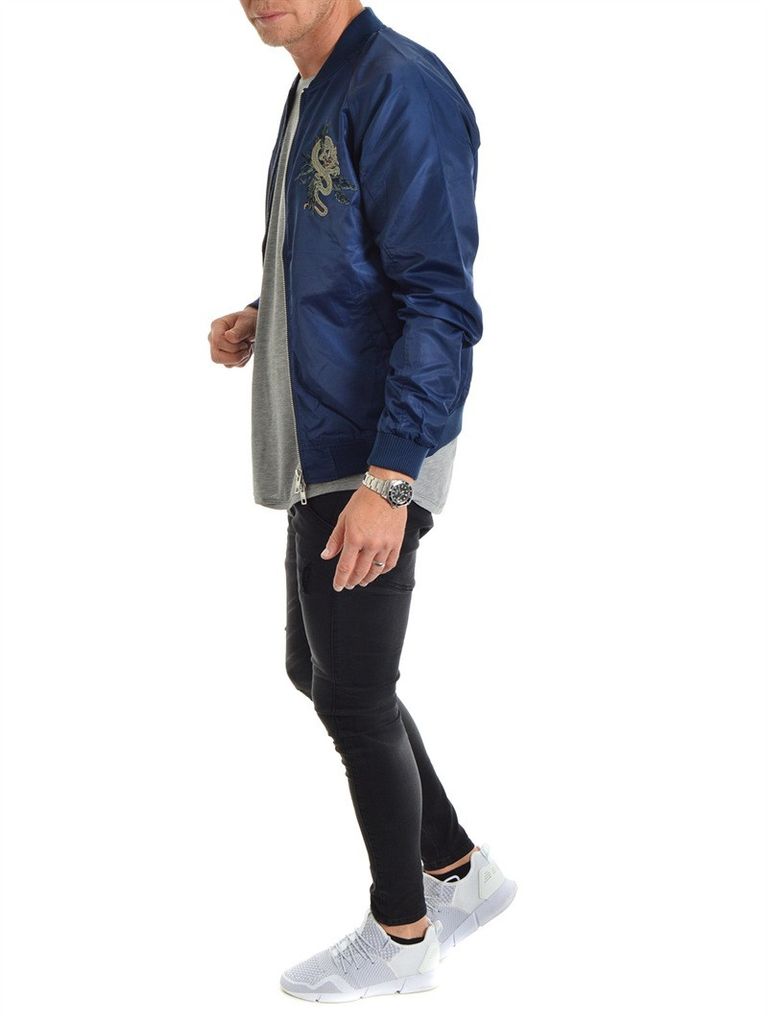 Vackert blå jacka från Minimum. Med snyggt brodyr av drakar på bröstet och ryggen. En tunn glansig jacka med raglanärmar och YKK-zipper. Fickor för händerna med tryckknapp och en innerficka med zipper. Normala i storleken men något åt det mindre hållet. (187cm/85kg och strl L)
