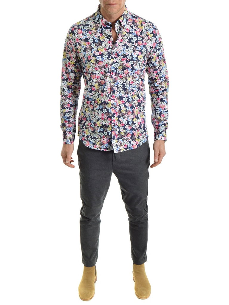 Blå skjorta från Robbie Moor i ett småblommigt mönster. Med buttondown-krage. Normala storlekar åt det mindre hållet och modern figursydd skärning. (På bild 187cm/85kg och strl L)