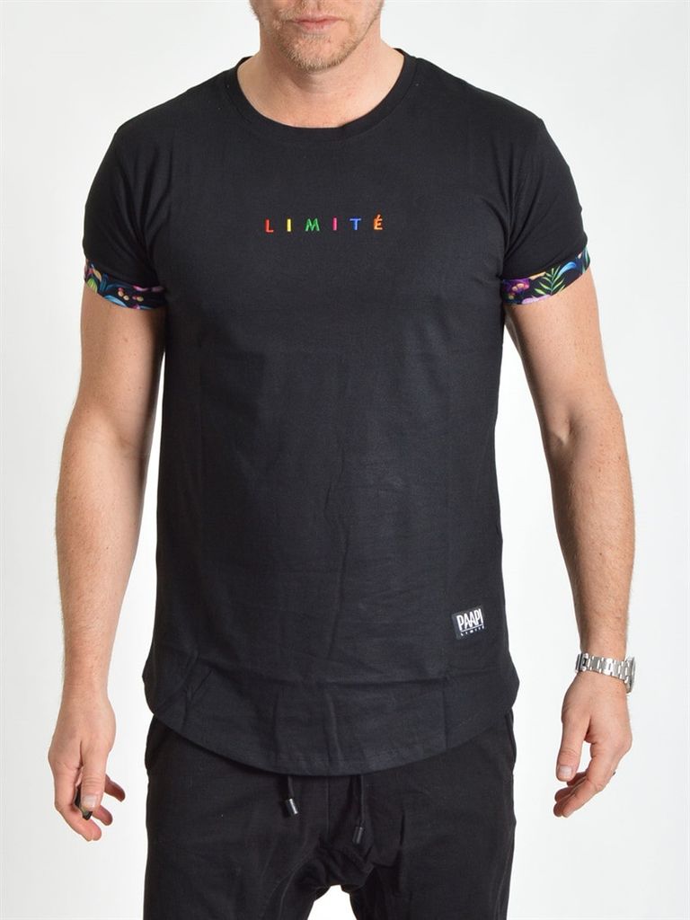 Svart t-shirt från Limité. Med snyggt flerfärgat blommigt tryck i mönstret på ärmarnas uppvik och broderad logotyp i multicolor på bröstet. Ärmarna är ganska korta och sitter tajt runt armen för rätt känsla. Uppviket är 2,5 cm långt och fastsytt på tre ställen för att säkerställa att det håller sig perfekt. Lätt rundad nedtill. (Modellen är 187cm/87kg och bär strl L)