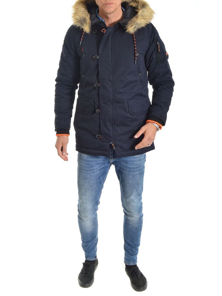Navy vinterparkas från Superdry med orange detaljer som gör att jackan står ut från mängden på ett mycket bra sätt. Luva med avtagbar fuskpäls. Fyra fickor med knappar fram samt innerficka. Muddar vid handleder för att hålla snö och kyla ute. Justerbara midja och luva. Normala storlekar som går åt det mindre hållet. Värme 4/5. (187cm/86kg och strl L)